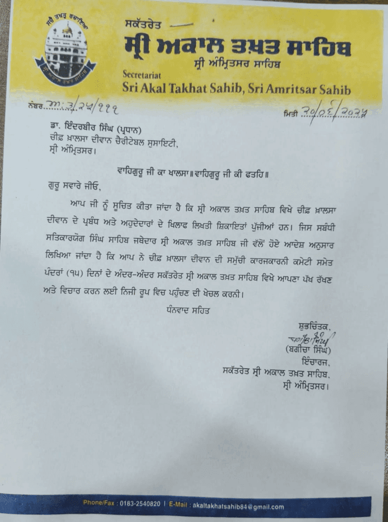 ਸ੍ਰੀ ਅਕਾਲ ਤਖ਼ਤ ਸਾਹਿਬ ਵੱਲੋਂ ਚੀਫ ਖਾਲਸਾ ਦੀਵਾਨ ਦੇ ਪ੍ਰਧਾਨ ਦੇ ਨਾਂ ਇੱਕ ਅਹਿਮ ਪੱਤਰ ਭੇਜਿਆ ਗਿਆ ਹੈ, ਜਿਸ ਰਾਹੀਂ ਰਾਹੀਂ ਸ੍ਰੀ ਅਕਾਲ ਤਖ਼ਤ ਸਾਹਿਬ ਨੇ ਚੀਫ ਖਾਲਸਾ ਦੀਵਾਨ ਦੀ ਸਮੁੱਚੀ ਕਾਰਜਕਾਰਨੀ ਕਮੇਟੀ 15 ਦਿਨਾਂ ਦੇ ਅੰਦਰ ਸਕੱਤਰੇਤ ਸ੍ਰੀ ਅਕਾਲ ਤਖ਼ਤ ਸਾਹਿਬ ਪਹੁੰਚ ਕੇ ਆਪਣਾ ਪੱਖ ਰੱਖਣ ਦਾ ਹੁਕਮ ਦਿੱਤਾ ਗਿਆ ਹੈ। ਦੱਸ ਦੇਈਏ ਕਿ ਚੀਫ ਖਾਲਸਾ ਦੀਵਾਨ ਦੇ ਪ੍ਰਬੰਧ ਤੇ ਅਹੁਦੇਦਾਰਾਂ ਖ਼ਿਲਾਫ਼ ਸ੍ਰੀ ਅਕਾਲ ਤਖਤ ਸਾਹਿਬ ਵਿਖੇ ਚੀਫ ਖਾਲਸਾ ਦੀਵਾਨ ਦੇ ਪ੍ਰਬੰਧ ਅਤੇ ਅਹੁਦੇਦਾਰਾਂ ਖਿਲਾਫ ਸ਼ਿਕਾਇਤਾਂ ਪਹੁੰਚੀਆਂ ਸਨ, ਜਿਸ ਕਰਕੇ ਇਹ ਹੁਕਮ ਦਿੱਤਾ ਗਿਆ ਹੈ।