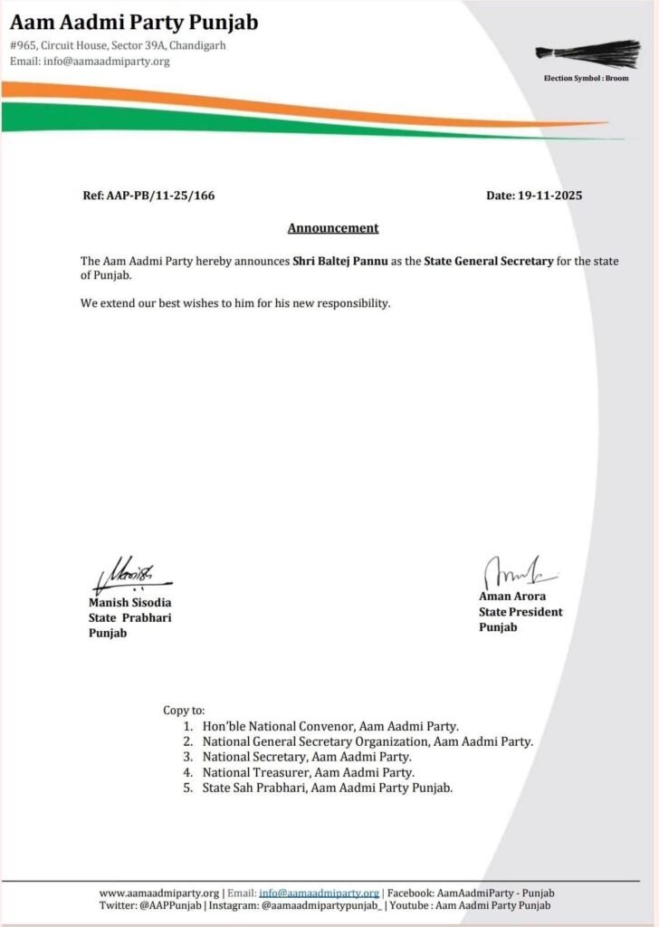 ਆਮ ਆਦਮੀ ਪਾਰਟੀ ਨੇ ਬਲਤੇਜ ਪੰਨੂ ਨੂੰ ਵੱਡੀ ਜ਼ਿੰਮੇਵਾਰੀ ਦਿੱਤੀ ਹੈ। ‘ਆਪ’ ਪਾਰਟੀ ਨੇ ਬਲਤੇਜ ਪੰਨੂ ਪੰਜਾਬ ‘ਆਪ’ ਪਾਰਟੀ ਦਾ ਸੂਬਾ ਜਨਰਲ ਸਕੱਤਰ ਬਣਾਇਆ ਹੈ।