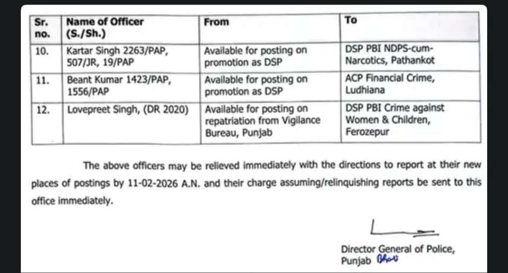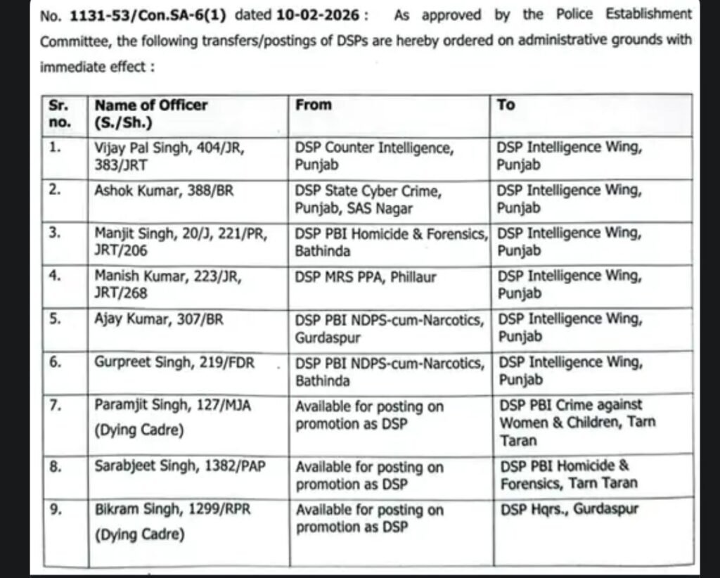 ਪੰਜਾਬ ਪੁਲਿਸ ਨੇ 12 ਡੀਐਸਪੀਜ਼ ਦੇ ਤਬਾਦਲੇ ਕੀਤੇ ਹਨ। ਇਨ੍ਹਾਂ ਵਿੱਚੋਂ ਛੇ ਨੂੰ ਇੰਟੈਲੀਜੈਂਸ ਵਿੰਗ ਵਿੱਚ ਤਾਇਨਾਤ ਕੀਤਾ ਗਿਆ ਹੈ, ਜਦੋਂ ਕਿ ਛੇ ਡੀਐਸਪੀਜ਼ ਨੂੰ ਵੱਖ-ਵੱਖ ਜ਼ਿਲ੍ਹਿਆਂ ਵਿੱਚ ਤਾਇਨਾਤ ਕੀਤਾ ਗਿਆ ਹੈ। ਇਹ ਹੁਕਮ ਤੁਰੰਤ ਪ੍ਰਭਾਵ ਨਾਲ ਲਾਗੂ ਕੀਤੇ ਗਏ ਹਨ।