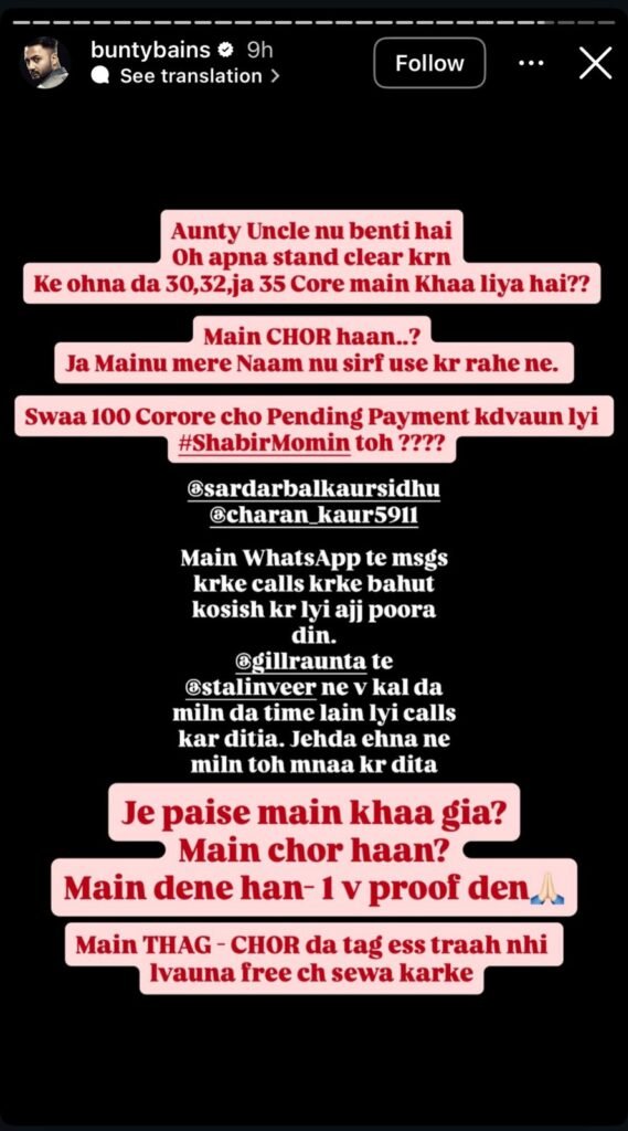 ਬੰਟੀ ਬੈਂਸ ਨੇ ਸੋਸ਼ਲ ਮੀਡੀਆ ‘ਤੇ ਪੋਸਟ ਸਾਂਝੀ ਕਰਦਿਆਂ ਕਿਹ, “ਮੈਂ ਚੋਰ ਹਾਂ, ਉਨ੍ਹਾਂ ਦੇ ਕਰੋੜਾਂ ਰੁਪਏ ਖਾ ਗਿਆ। ਮੈਂ ਠੱਗ ਚੋਰ ਦਾ ਟੈਗ ਇਸ ਤਰ੍ਹਾਂ ਨਹੀਂ ਲਗਵਾਉਣਾ, ਫ੍ਰੀ ਵਿਚ ਸੇਵਾ ਕਰਕੇ। ਤਾਂ ਬੰਟੀ ਬੈਂਸ ਵੱਲੋਂ ਕਿਹਾ ਗਿਆ ਕਿ ਮੈਂ ਸਿੱਧੂ ਦੇ ਮਾਪਿਆਂ ਦੇ 30-32-35 ਕਰੋੜ ਖਾ ਗਿਆ? ਉਹ ਮੇਰੇ ‘ਤੇ ਚੋਰ ਦਾ ਟੈਗ ਲਗਾ ਰਹੇ ਹਨ। ਮੈਂ ਚੋਰ ਹਾਂ ਜਾਂ ਸਿਰਫ ਮੈਨੂੰ ਮੇਰੇ ਨਾਂ ਨੂੰ ਇਸਤੇਮਾਲ ਕਰ ਰਹੇ ਹਨ। 125 ਕਰੋੜ ਰੁਪਏ ਦੀ ਪੈਂਡਿੰਗ ਪੇਮੈਂਟ ਕਢਵਾਉਣ ਲਈ ਸ਼ਬੀਰ ਮੋਮਿਨ ਨਾਂ ਦੇ ਸ਼ਖਸ ‘ਤੇ ਬੰਟੀ ਬੈਂਸ ਵੱਲੋਂ ਦੋਸ਼ ਲਗਾਏ ਗਏ ਸਨ।”