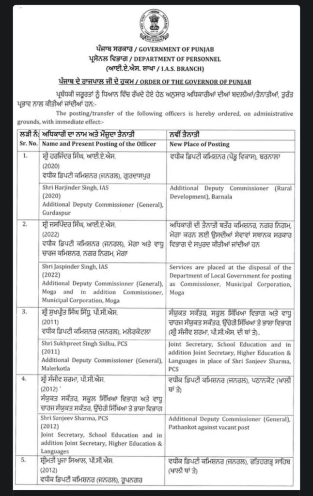 ਤਬਾਦਲੇ ਕੀਤੇ ਗਏ ਆਈਏਐਸ ਅਧਿਕਾਰੀਆਂ ਵਿੱਚੋਂ, ਹਰਜਿੰਦਰ ਸਿੰਘ ਨੂੰ ਗੁਰਦਾਸਪੁਰ ਦੇ ਏਡੀਸੀ (ਜਨਰਲ) ਤੋਂ ਬਰਨਾਲਾ ਦੇ ਏਡੀਸੀ (ਪੇਂਡੂ ਵਿਕਾਸ) ਵਿੱਚ ਤਬਦੀਲ ਕਰ ਦਿੱਤਾ ਗਿਆ ਹੈ। ਜਸਵਿੰਦਰ ਸਿੰਘ ਨੂੰ ਏਡੀਸੀ ਜਨਰਲ ਮੋਗਾ ਦੇ ਨਾਲ ਨਗਰ ਨਿਗਮ ਕਮਿਸ਼ਨਰ ਮੋਗਾ ਦਾ ਚਾਰਜ ਦਿੱਤਾ ਗਿਆ ਹੈ।