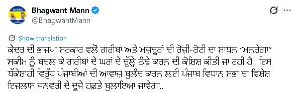 ਟਵੀਟ ਕਰਦਿਆਂ ਮੁੱਖ ਮੰਤਰੀ ਮਾਨ ਨੇ ਲਿਖਿਆ, “ਕੇਂਦਰ ਦੀ ਭਾਜਪਾ ਸਰਕਾਰ ਵੱਲੋਂ ਗਰੀਬਾਂ ਤੇ ਮਜ਼ਦੂਰਾਂ ਦੀ ਰੋਜ਼ੀ-ਰੋਟੀ ਦਾ ਸਾਧਨ ‘ਮਨਰੇਗਾ ਸਕੀਮ’ ਨੂੰ ਬਦਲ ਕੇ ਗਰੀਬਾਂ ਦੇ ਘਰਾਂ ਦੇ ਚੁੱਲ੍ਹੇ ਠੰਡੇ ਕਰਨ ਦੀ ਕੋਸ਼ਿਸ਼ ਕੀਤੀ ਜਾ ਰਹੀ ਹੈ। ਇਸੇ ਧੱਕੇਸ਼ਾਹੀ ਵਿਰੁੱਧ ਪੰਜਾਬੀਆਂ ਦੀ ਆਵਾਜ਼ ਬੁਲੰਦ ਕਰਨ ਲਈ ਪੰਜਾਬ ਵਿਧਾਨ ਸਭਾ ਦਾ ਵਿਸ਼ੇਸ਼ ਇਜਲਾਸ ਜਨਵਰੀ ਦੇ ਦੂਜੇ ਹਫਤੇ ਬੁਲਾਇਆ ਜਾਵੇਗਾ।”