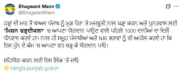 ਮੁੱਖ ਮੰਤਰੀ ਭਗਵੰਤ ਮਾਨ ਸੋਸ਼ਲ ਮੀਡੀਆ ‘ਤੇ ਲੋਕਾਂ ਦਾ ਧੰਨਵਾਦ ਕਰਦਿਆਂ ਲਿਖਿਆ, “ਹੜ੍ਹਾਂ ਦੀ ਮਾਰ ਤੋਂ ਬਾਅਦ ਪੰਜਾਬ ਨੂੰ ਮੁੜ ਪੈਰਾਂ ‘ਤੇ ਮਜ਼ਬੂਤੀ ਨਾਲ ਖੜ੍ਹਾ ਕਰਨ ਅਤੇ ਪੁਨਰਵਾਸ ਲਈ ‘ਮਿਸ਼ਨ ਚੜ੍ਹਦੀਕਲਾ’ ‘ਚ ਆਪਣਾ ਯੋਗਦਾਨ ਪਾਉਣ ਵਾਲੇ ਪਹਿਲੇ 1000 ਦਾਨੀਆਂ ਦਾ ਦਿਲੋਂ ਧੰਨਵਾਦ ਕਰਦੇ ਹਾਂ।” ਨਾਲ ਹੀ ਸਮੂਹ ਪੰਜਾਬੀਆਂ ਅਤੇ NRI ਭਰਾਵਾਂ ਨੂੰ ਵੀ ਅਪੀਲ ਕਰਦੇ ਹਾਂ ਕਿ ਇਸ ਪੁੰਨ ਦੇ ਕੰਮ ‘ਚ ਆਪਣਾ ਵਧ ਚੜ੍ਹ ਕੇ ਯੋਗਦਾਨ ਪਾਓ।