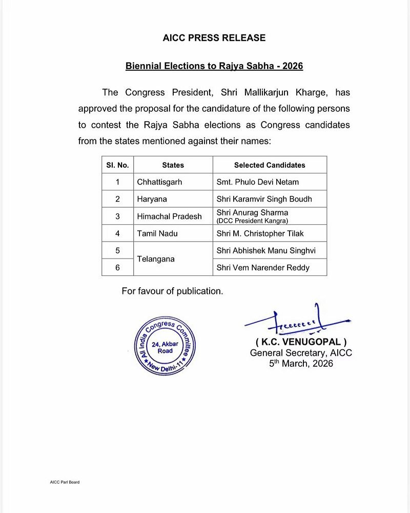 ਪਾਰਟੀ ਨੇ ਤੇਲੰਗਾਨਾ ਤੋਂ ਦੋ ਨਾਵਾਂ ਦਾ ਐਲਾਨ ਕੀਤਾ ਹੈ। ਪਾਰਟੀ ਦੇ ਸੀਨੀਅਰ ਨੇਤਾ ਅਤੇ ਸੁਪਰੀਮ ਕੋਰਟ ਦੇ ਪ੍ਰਸਿੱਧ ਵਕੀਲ ਅਭਿਸ਼ੇਕ ਮਨੂ ਸਿੰਘਵੀ ਨੂੰ ਦੁਬਾਰਾ ਨਾਮਜ਼ਦ ਕੀਤਾ ਗਿਆ ਹੈ। ਸਿੰਘਵੀ ਪਹਿਲਾਂ ਰਾਜ ਸਭਾ ਮੈਂਬਰ ਵਜੋਂ ਸੇਵਾ ਨਿਭਾ ਚੁੱਕੇ ਹਨ।