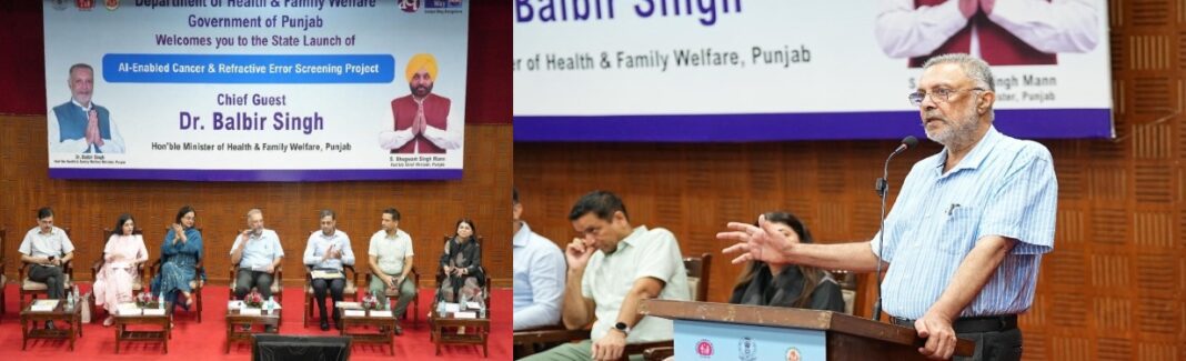 ਇਸ ਇਤਿਹਾਸਕ ਪ੍ਰੋਗਰਾਮ ਦਾ ਰਸਮੀ ਉਦਘਾਟਨ ਸਿਹਤ ਮੰਤਰੀ ਡਾ. ਬਲਬੀਰ ਸਿੰਘ ਨੇ ਚੰਡੀਗੜ੍ਹ ਮਿਊਂਸਿਪਲ ਭਵਨ ਤੋਂ ਕੀਤਾ। ਇਸ ਮੌਕੇ ‘ਤੇ ਬੋਲਦੇ ਹੋਏ, ਸਿਹਤ ਮੰਤਰੀ ਨੇ ਕਿਹਾ ਕਿ ਮਨੁੱਖ ਕੁਦਰਤ ਦੀ ਇੱਕ ਸੁੰਦਰ ਰਚਨਾ ਹੈ ਅਤੇ ਮਨੁੱਖ ਨੇ ਸਰੀਰ ਨਾਲ ਜੁੜੀਆਂ ਕਈ ਤਰ੍ਹਾਂ ਦੀਆਂ ਲੜਾਈਆਂ ਲੜੀਆਂ ਹਨ। ਉਨ੍ਹਾਂ ਕਿਹਾ ਕਿ ਕੈਂਸਰ ਇੱਕ ਭਿਆਨਕ ਬਿਮਾਰੀ ਹੈ। ਇਸ ਲਈ, ਲੋਕਾਂ ਦੀ ਸਿਹਤ ਨੂੰ ਧਿਆਨ ਵਿੱਚ ਰੱਖਦੇ ਹੋਏ ਪੰਜਾਬ ਸਰਕਾਰ ਦੁਆਰਾ ਇਹ ਇਤਿਹਾਸਕ ਕਦਮ ਚੁੱਕਿਆ ਗਿਆ ਹੈ ਅਤੇ ਹੁਣ ਏ.ਆਈ. ਦੇ ਮਾਧਿਅਮ ਨਾਲ ਕੈਂਸਰ ਅਤੇ ਅੱਖਾਂ ਦੀ ਜਾਂਚ ਕੀਤੀ ਜਾ ਸਕੇਗੀ।ਸਿਹਤ ਮੰਤਰੀ ਨੇ ਇਹ ਵੀ ਦੱਸਿਆ ਕਿ ਸਰਕਾਰ ਦਾ ਟੀਚਾ ਰੋਜ਼ਾਨਾ 600 ਅੱਖਾਂ ਦੀ ਜਾਂਚ ਅਤੇ 300 ਛਾਤੀ ਅਤੇ ਸਰਵਾਈਕਲ ਕੈਂਸਰ ਦੀ ਸਕ੍ਰੀਨਿੰਗ ਕਰਨਾ ਹੈ। ਸਰਕਾਰ ਦਾ ਇਹ ਕਦਮ ਨਾ ਸਿਰਫ਼ ਪੰਜਾਬ ਦੀਆਂ ਔਰਤਾਂ ਬਲਕਿ ਪੂਰੇ ਸਮਾਜ ਨੂੰ ਇੱਕ ਨਵੀਂ ਸੁਰੱਖਿਆ ਦੇਵੇਗਾ, ਕਿਉਂਕਿ ਕੈਂਸਰ ਵਰਗੀਆਂ ਘਾਤਕ ਬਿਮਾਰੀਆਂ ਦੀ ਸਮੇਂ ਸਿਰ ਪਛਾਣ ਹੀ ਇਲਾਜ ਦਾ ਸਭ ਤੋਂ ਵੱਡਾ ਹਥਿਆਰ ਹੈ। ਖ ਮੰਤਰੀ ਭਗਵੰਤ ਸਿੰਘ ਮਾਨ ਦੀ ਸੋਚ ਅਨੁਸਾਰ ਸਿਹਤ ਸੇਵਾਵਾਂ ਨੂੰ ਹੋਰ ਮਜ਼ਬੂਤ ਬਣਾਉਣ ਲਈ ਪੰਜਾਬ ਦੇ ਸਿਹਤ ਅਤੇ ਪਰਿਵਾਰ ਭਲਾਈ ਮੰਤਰੀ ਡਾ. ਬਲਬੀਰ ਸਿੰਘ ਨੇ ਇਹਨਾਂ ਅਤਿਆਧੁਨਿਕ AI ਅਧਾਰਿਤ ਸਕ੍ਰੀਨਿੰਗ ਡਿਵਾਈਸਾਂ ਨੂੰ ਲਾਂਚ ਕੀਤਾ। ਇਹ ਡਿਵਾਈਸ ਛਾਤੀ ਦੇ ਕੈਂਸਰ, ਸਰਵਾਈਕਲ ਕੈਂਸਰ ਅਤੇ ਨਜ਼ਰ ਦੀ ਕਮਜ਼ੋਰੀ ਦਾ ਸਮਾਂ ਰਹਿੰਦਿਆਂ ਪਤਾ ਲਗਾਉਣ ਵਿੱਚ ਮਦਦ ਕਰਨਗੇ।