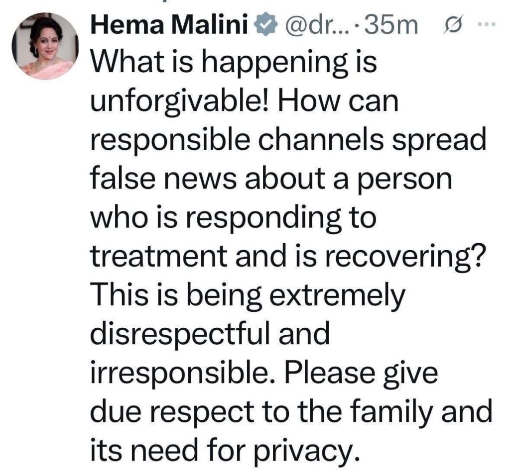 ਬਾਲੀਵੁੱਡ ਦੇ ਦਿੱਗਜ ਅਦਾਕਾਰ ਧਰਮਿੰਦਰ ਦੀ ਪਤਨੀ ਹੇਮਾ ਮਾਲਿਨੀ ਨੇ ਸੋਸ਼ਲ ਮੀਡੀਆ ‘ਤੇ ਪੋਸਟ ਕੀਤਾ, “ਜੋ ਹੋ ਰਿਹਾ ਹੈ ਉਹ ਮੁਆਫ਼ ਕਰਨ ਯੋਗ ਨਹੀਂ ਹੈ! ਜ਼ਿੰਮੇਵਾਰ ਚੈਨਲ ਇੱਕ ਅਜਿਹੇ ਵਿਅਕਤੀ ਬਾਰੇ ਝੂਠੀਆਂ ਖ਼ਬਰਾਂ ਕਿਵੇਂ ਫੈਲਾ ਸਕਦੇ ਹਨ ਜੋ ਇਲਾਜ ਪ੍ਰਤੀ ਹੁੰਗਾਰਾ ਭਰ ਰਿਹਾ ਹੈ ਅਤੇ ਠੀਕ ਹੋ ਰਿਹਾ ਹੈ? ਇਹ ਬਹੁਤ ਹੀ ਨਿਰਾਦਰਜਨਕ ਅਤੇ ਗੈਰ-ਜ਼ਿੰਮੇਵਾਰਾਨਾ ਹੈ। ਕਿਰਪਾ ਕਰਕੇ ਪਰਿਵਾਰ ਅਤੇ ਉਸਦੀ ਨਿੱਜਤਾ ਦੀ ਜ਼ਰੂਰਤ ਦਾ ਪੂਰਾ ਸਤਿਕਾਰ ਕਰੋ।”