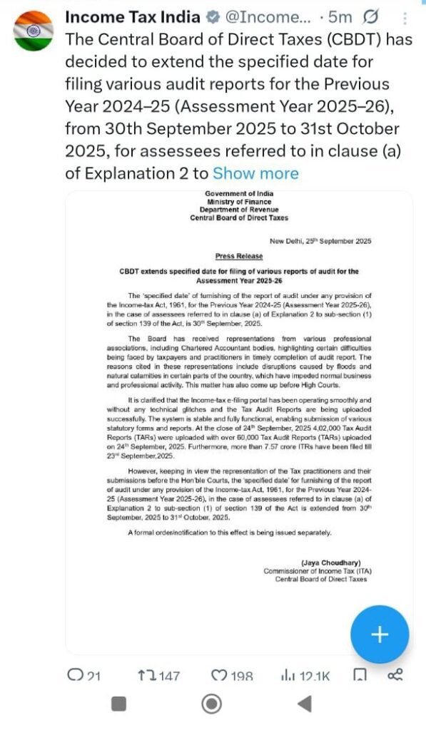 ਆਮਦਨ ਕਰ ਵਿਭਾਗ ਨੇ ਆਪਣੇ ਅਧਿਕਾਰਤ ਹੈਂਡਲ ਰਾਹੀਂ ਇਸਦਾ ਐਲਾਨ ਕੀਤਾ। ਵਿਭਾਗ ਨੇ X ‘ਤੇ ਪੋਸਟ ਕੀਤਾ, “ਸੈਂਟਰਲ ਬੋਰਡ ਆਫ਼ ਡਾਇਰੈਕਟ ਟੈਕਸ (CBDT) ਨੇ ਐਕਟ ਦੀ ਧਾਰਾ 139 ਦੀ ਉਪ-ਧਾਰਾ (1) ਦੀ ਵਿਆਖਿਆ 2 ਦੀ ਧਾਰਾ (a) ਵਿੱਚ ਦਰਸਾਏ ਗਏ ਟੈਕਸਦਾਤਾਵਾਂ ਲਈ ਪਿਛਲੇ ਸਾਲ 2024-25 (ਮੁਲਾਂਕਣ ਸਾਲ 2025-26) ਲਈ ਵੱਖ-ਵੱਖ ਆਡਿਟ ਰਿਪੋਰਟਾਂ ਦਾਇਰ ਕਰਨ ਦੀ ਆਖਰੀ ਮਿਤੀ 30 ਸਤੰਬਰ, 2025 ਤੋਂ ਵਧਾ ਕੇ 31 ਅਕਤੂਬਰ, 2025 ਕਰਨ ਦਾ ਫੈਸਲਾ ਕੀਤਾ ਹੈ।”