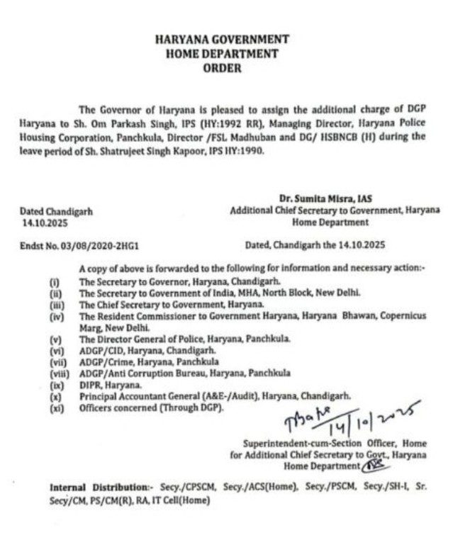 ਹਰਿਆਣਾ ਦੇ ADGP ਵਾਈ ਪੂਰਨ ਕੁਮਾਰ ਦੇ ਖ਼ੁਦਕੁਸ਼ੀ ਮਾਮਲੇ ਤੋਂ ਕਰੀਬ ਸੱਤ ਦਿਨ ਬਾਅਦ, ਪੁਲਿਸ ਡਾਇਰੈਕਟਰ ਜਨਰਲ ਸ਼ਤਰੂਜੀਤ ਕਪੂਰ ਨੂੰ ਉਨ੍ਹਾਂ ਦੇ ਅਹੁਦੇ ਤੋਂ ਹਟਾ ਕੇ ਛੁੱਟੀ ‘ਤੇ ਭੇਜ ਦਿੱਤਾ ਗਿਆ ਹੈ।