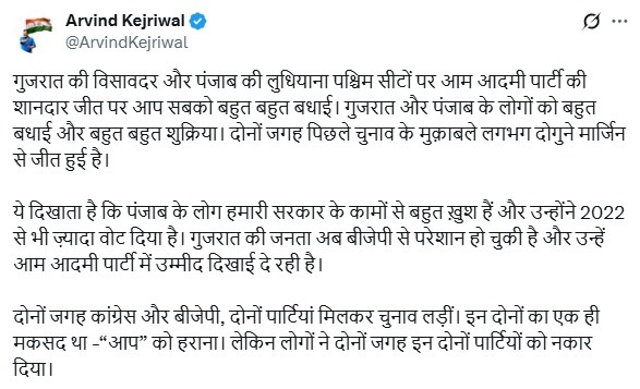 ਕੇਜਰੀਵਾਲ ਨੇ ਕਿਹਾ ਕਿ “ਪੰਜਾਬ ਦੀ ਲੁਧਿਆਣਾ ਪੱਛਮੀ ਸੀਟਾਂ ‘ਤੇ ਆਮ ਆਦਮੀ ਪਾਰਟੀ ਦੀ ਸ਼ਾਨਦਾਰ ਜਿੱਤ ‘ਤੇ ਸਾਰਿਆਂ ਨੂੰ ਬਹੁਤ-ਬਹੁਤ ਵਧਾਈ। ਗੁਜਰਾਤ ਤੇ ਪੰਜਾਬ ਦੇ ਲੋਕਾਂ ਨੂੰ ਬਹੁਤ ਵਧਾਈ ਤੇ ਬਹੁਤ-ਬਹੁਤ ਧੰਨਵਾਦ। ਦੋਵਾਂ ਚੋਣਾਂ ਦੇ ਮੁਕਾਬਲੇ ਲਗਭਗ ਦੁੱਗਣੇ ਮਾਰਜਿਨ ਨਾਲ ਜਿੱਤ ਹੋਈ ਹੈ।