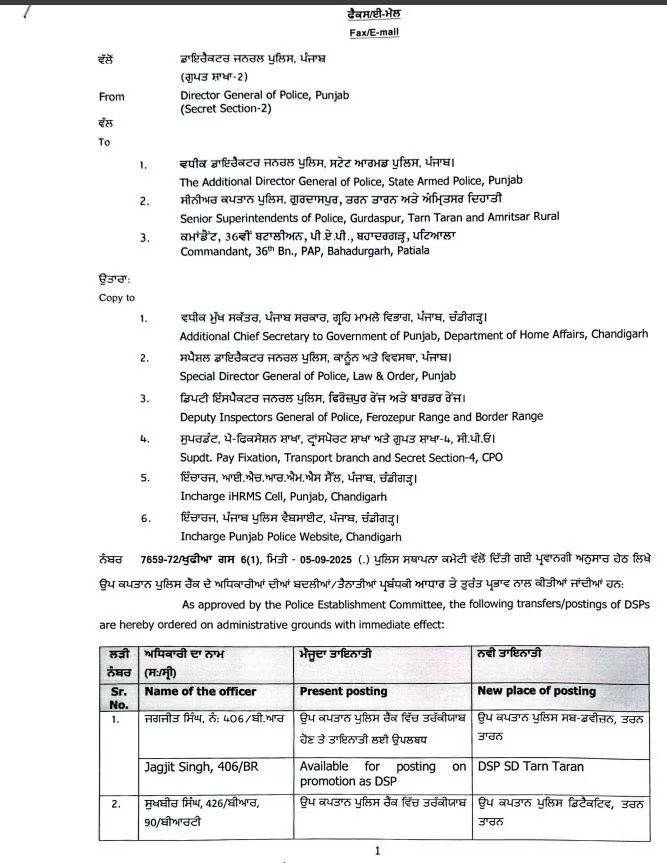 ਪੰਜਾਬ ‘ਚ ਵੱਡਾ ਪ੍ਰਸ਼ਾਸਨਿਕ ਫੇਰਬਦਲ, DSP ਰੈਂਕ ਦੇ ਅਧਿਕਾਰੀਆਂ ਦੇ ਕੀਤੇ ਗਏ ਤਬਾਦਲੇ, ਪੜ੍ਹੋ ਸੂਚੀ
