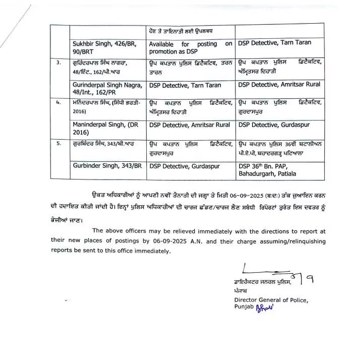ਪੰਜਾਬ ਸਰਕਾਰ ਵੱਲੋਂ ਪੰਜਾਬ ਪੁਲਿਸ ਦੇ ਪੰਜ ਅਧਿਕਾਰੀਆਂ ਦੇ ਤਬਾਦਲੇ ਕਰ ਦਿੱਤੇ ਗਏ ਹਨ। ਇਹ ਸਾਰੇ ਅਧਿਕਾਰੀ DSP ਰੈਂਕ ਦੇ ਹਨ। ਹੁਕਮਾਂ ਨੂੰ ਤੁਰੰਤ ਪ੍ਰਭਾਵ ਨਾਲ ਲਾਗੂ ਕਰਨ ਲਈ ਕਿਹਾ ਗਿਆ ਹੈ। ਜਿਨ੍ਹਾਂ ਅਧਿਕਾਰੀਆਂ ਦੇ ਤਬਾਦਲੇ ਕੀਤੇ ਗਏ ਹਨ ਉਨ੍ਹਾਂ ਦੀ ਲਿਸਟ ਹੇਠਾਂ ਦਿੱਤੇ ਮੁਤਾਬਕ ਹੈ :