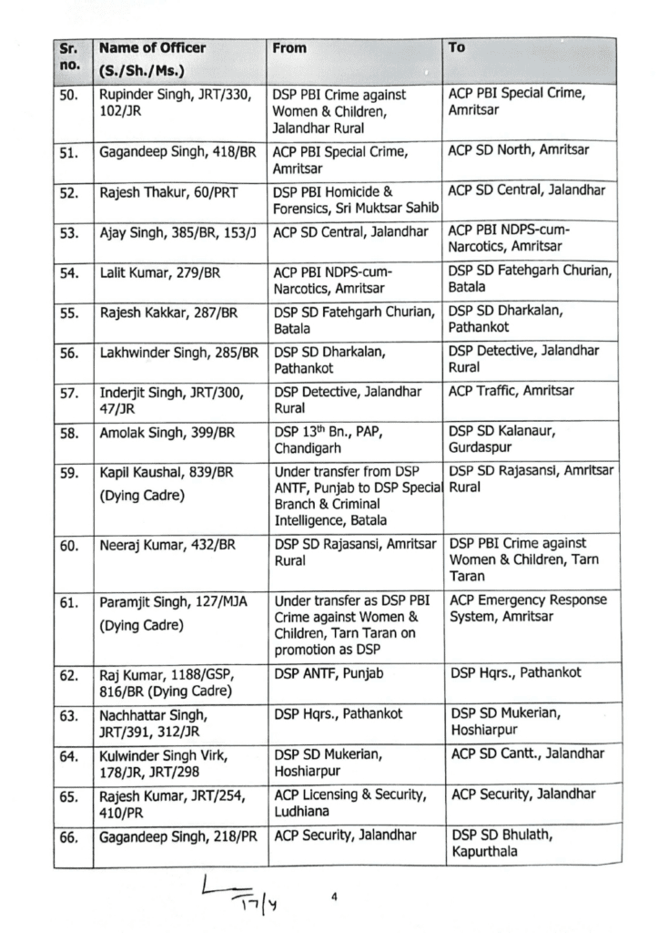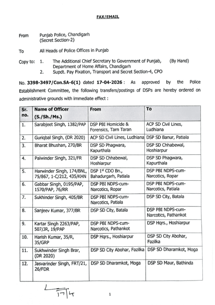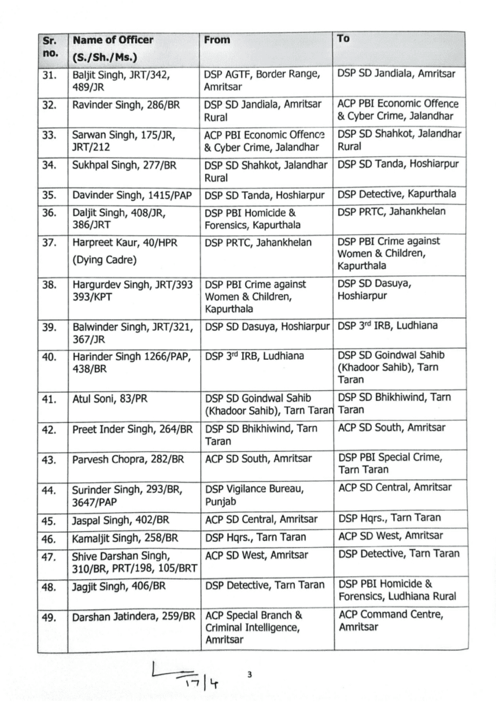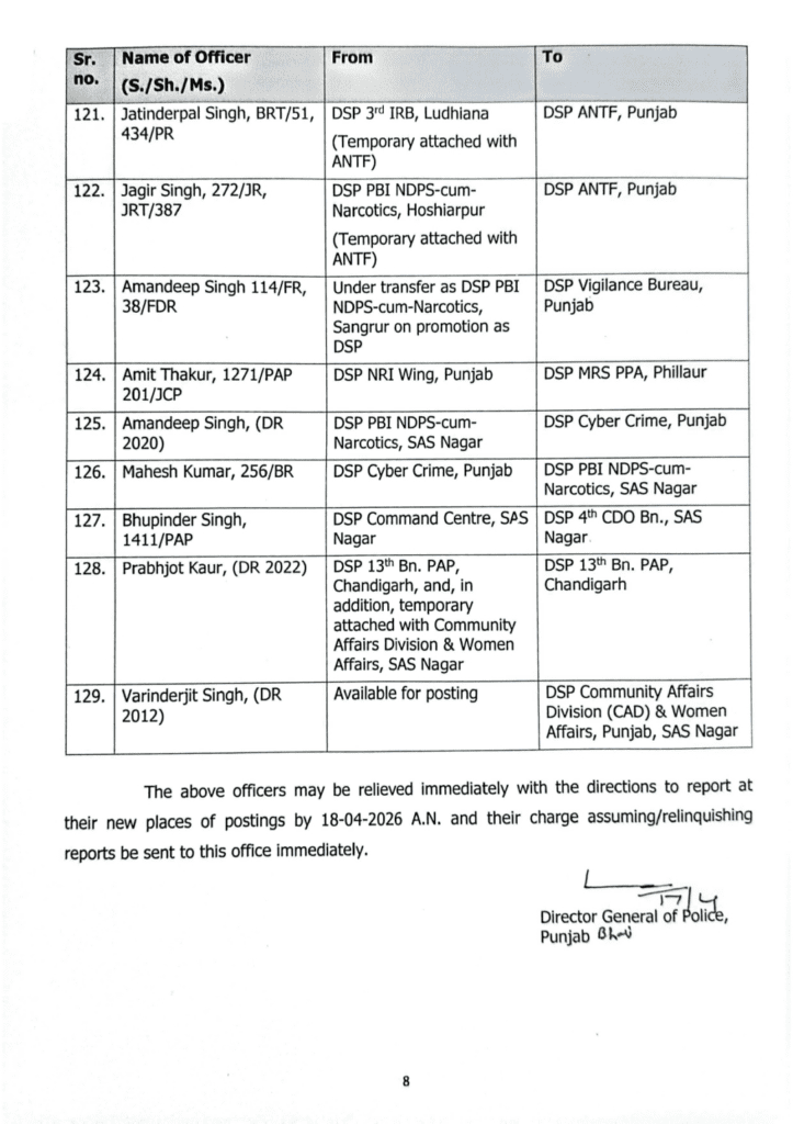 129 ਡੀਐਸਪੀ/ਏਸੀਪੀ ਅਧਿਕਾਰੀਆਂ ਦਾ ਤੁਰੰਤ ਪ੍ਰਭਾਵ ਨਾਲ ਤਬਾਦਲਾ ਕਰ ਦਿੱਤਾ ਗਿਆ ਹੈ। ਪੁਲਿਸ ਹੈੱਡਕੁਆਰਟਰ ਵੱਲੋਂ ਜਾਰੀ ਹੁਕਮਾਂ ਅਨੁਸਾਰ, ਇਨ੍ਹਾਂ ਅਧਿਕਾਰੀਆਂ ਨੂੰ 18 ਅਪ੍ਰੈਲ ਦੀ ਦੁਪਹਿਰ ਤੱਕ ਆਪਣੀਆਂ ਨਵੀਆਂ ਪੋਸਟਿੰਗਾਂ ‘ਤੇ ਰਿਪੋਰਟ ਕਰਨ ਦੇ ਨਿਰਦੇਸ਼ ਦਿੱਤੇ ਗਏ ਹਨ। ਅਗਲੇ ਸਾਲ ਹੋਣ ਵਾਲੀਆਂ ਚੋਣਾਂ ਤੋਂ ਪਹਿਲਾਂ ਇਸ ਫੇਰਬਦਲ ਨੂੰ ਮਹੱਤਵਪੂਰਨ ਮੰਨਿਆ ਜਾ ਰਿਹਾ ਹੈ।
