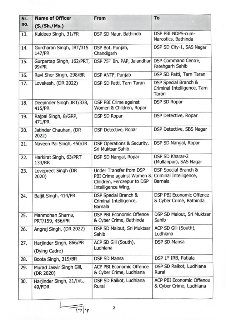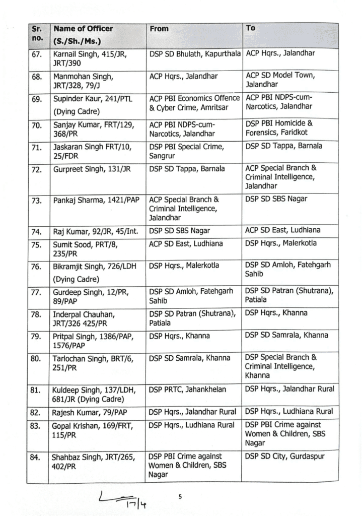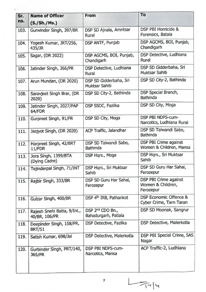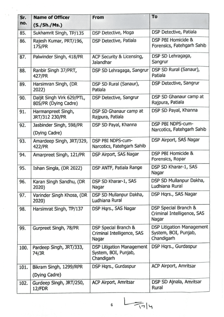 ਪੰਜਾਬ ਪੁਲਿਸ ਵਿਭਾਗ ਵਿੱਚ ਵੱਡਾ ਫੇਰਬਦਲ ਹੋਇਆ ਹੈ। ਸੂਬੇ ਵਿੱਚ ਨਗਰ ਨਿਗਮ ਚੋਣਾਂ ਦੇ ਐਲਾਨ ਤੋਂ ਪਹਿਲਾਂ, ਸਰਕਾਰ ਨੇ 129 ਡੀਐਸਪੀ/ਏਸੀਪੀ ਰੈਂਕ ਦੇ ਅਧਿਕਾਰੀਆਂ ਦੇ ਤਬਾਦਲੇ ਕਰ ਦਿੱਤੇ ਹਨ। ਪੰਜਾਬ ਦੇ ਡਾਇਰੈਕਟਰ ਜਨਰਲ ਆਫ਼ ਪੁਲਿਸ ਗੌਰਵ ਯਾਦਵ ਨੇ ਇਸ ਸਬੰਧ ਵਿੱਚ ਇੱਕ ਹੁਕਮ ਜਾਰੀ ਕੀਤਾ ਹੈ। ਤਰੱਕੀ ਦੀ ਉਡੀਕ ਕਰ ਰਹੇ ਇੱਕ ਅਧਿਕਾਰੀ ਨੂੰ ਡੀਐਸਪੀ ਨਿਯੁਕਤ ਕੀਤਾ ਗਿਆ ਹੈ।