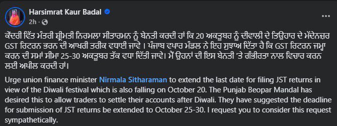 ਉਨ੍ਹਾਂ ਨੇ ਸੋਸ਼ਲ ਮੀਡੀਆ ‘ਤੇ ਪੋਸਟ ਕਰਦਿਆਂ ਲਿਖਿਆ, “ਪੰਜਾਬ ਵਪਾਰ ਮੰਡਲ ਨੇ ਇਹ ਸੁਝਾਅ ਦਿੱਤਾ ਹੈ ਕਿ GST ਰਿਟਰਨ ਜਮ੍ਹਾ ਕਰਨ ਦੀ ਸਮਾਂ ਸੀਮਾ 25-30 ਅਕਤੂਬਰ ਤੱਕ ਵਧਾ ਦਿੱਤੀ ਜਾਵੇ। ਮੈਂ ਉਹਨਾਂ ਦੀ ਇਸ ਬੇਨਤੀ ‘ਤੇ ਗੰਭੀਰਤਾ ਨਾਲ ਵਿਚਾਰ ਕਰਨ ਲਈ ਅਪੀਲ ਕਰਦੀ ਹਾਂ।”