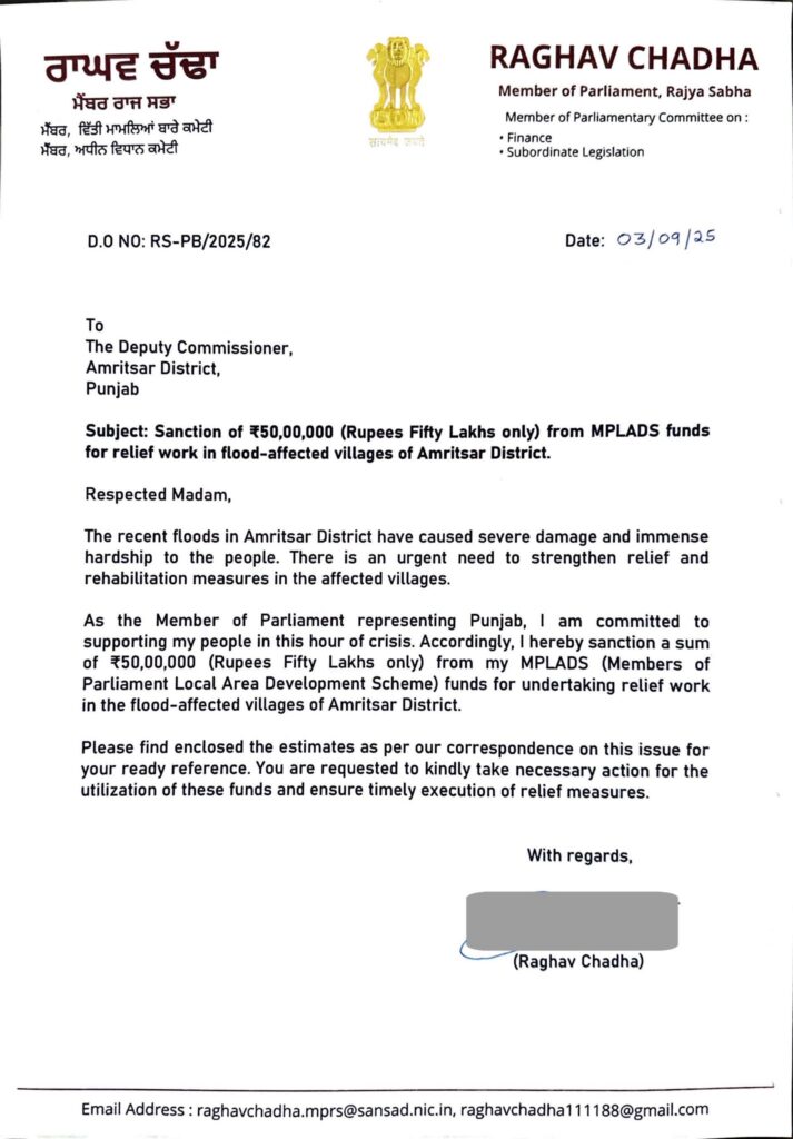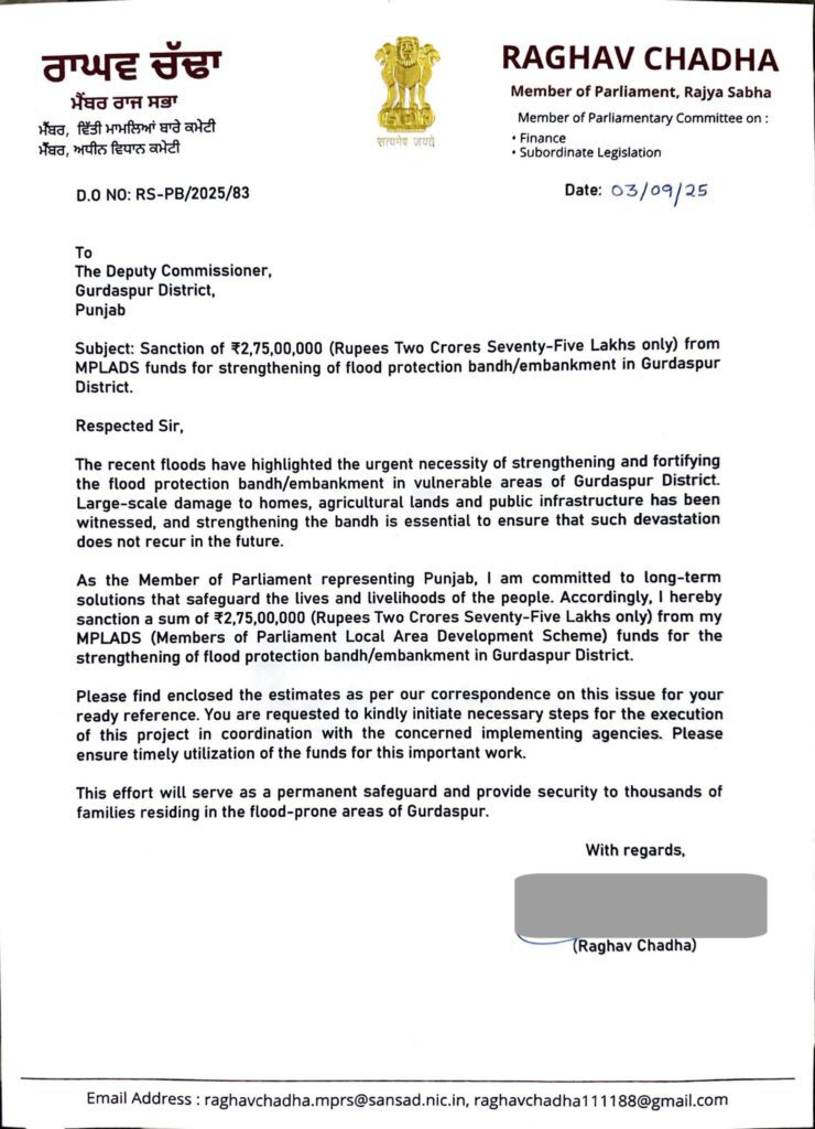 MP Raghav Chadha announced to give Rs 3.25 crore from MP funds : ਪੰਜਾਬ ਇਸ ਸਮੇਂ ਭਿਆਨਕ ਹੜ੍ਹ ਨਾਲ ਜੂਝ ਰਿਹਾ ਹੈ। ਇਨ੍ਹਾਂ ਹੜ੍ਹਾਂ ਨੇ ਹੁਣ ਤੱਕ 30 ਤੋਂ ਵੱਧ ਲੋਕਾਂ ਦੀ ਜਾਨ ਲੈ ਲਈ ਹੈ ਅਤੇ ਹਜ਼ਾਰਾਂ ਘਰ ਤਬਾਹ ਹੋ ਗਏ ਹਨ। ਕਿਸਾਨਾਂ ਦੇ ਖੇਤ ਪੂਰੀ ਤਰ੍ਹਾਂ ਪਾਣੀ ਵਿਚ ਡੁੱਬ ਗਏ ਹਨ ਤੇ ਪਸ਼ੂਆਂ ਨੂੰ ਵੀ ਭਾਰੀ ਨੁਕਸਾਨ ਹੋਇਆ ਹੈ। ਹੜ੍ਹਾਂ ਕਾਰਨ ਪੰਜਾਬ ਦੇ ਹਾਲਾਤ ਗੰਭੀਰ ਬਣੇ ਹੋਏ ਹਨ ਤੇ ਪ੍ਰਭਾਵਿਤ ਇਲਾਕਿਆਂ ‘ਚ ਲੋਕ ਪ੍ਰੇਸ਼ਾਨ ਹੋ ਚੁੱਕੇ ਹਨ।