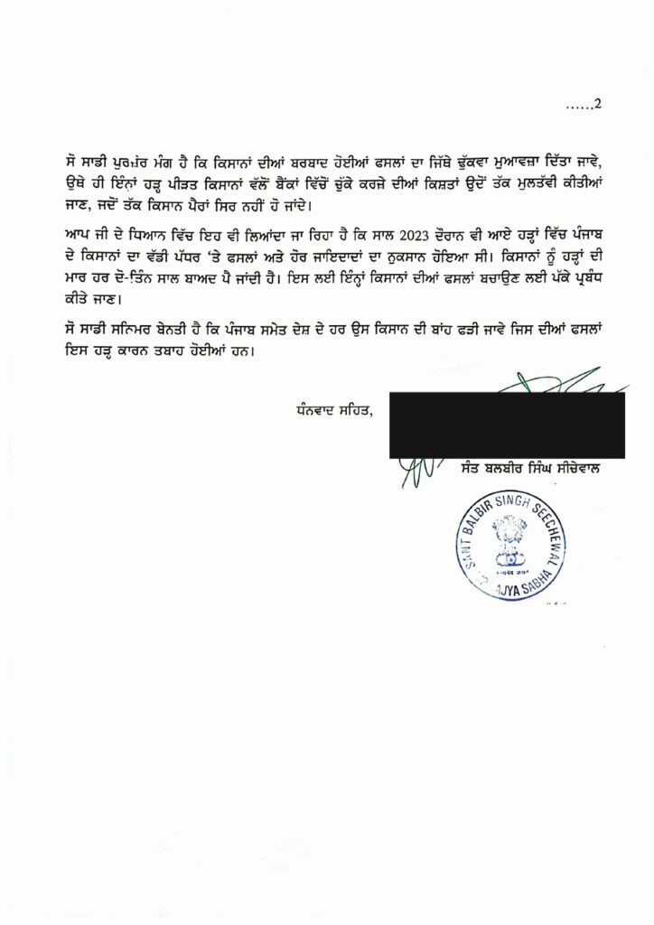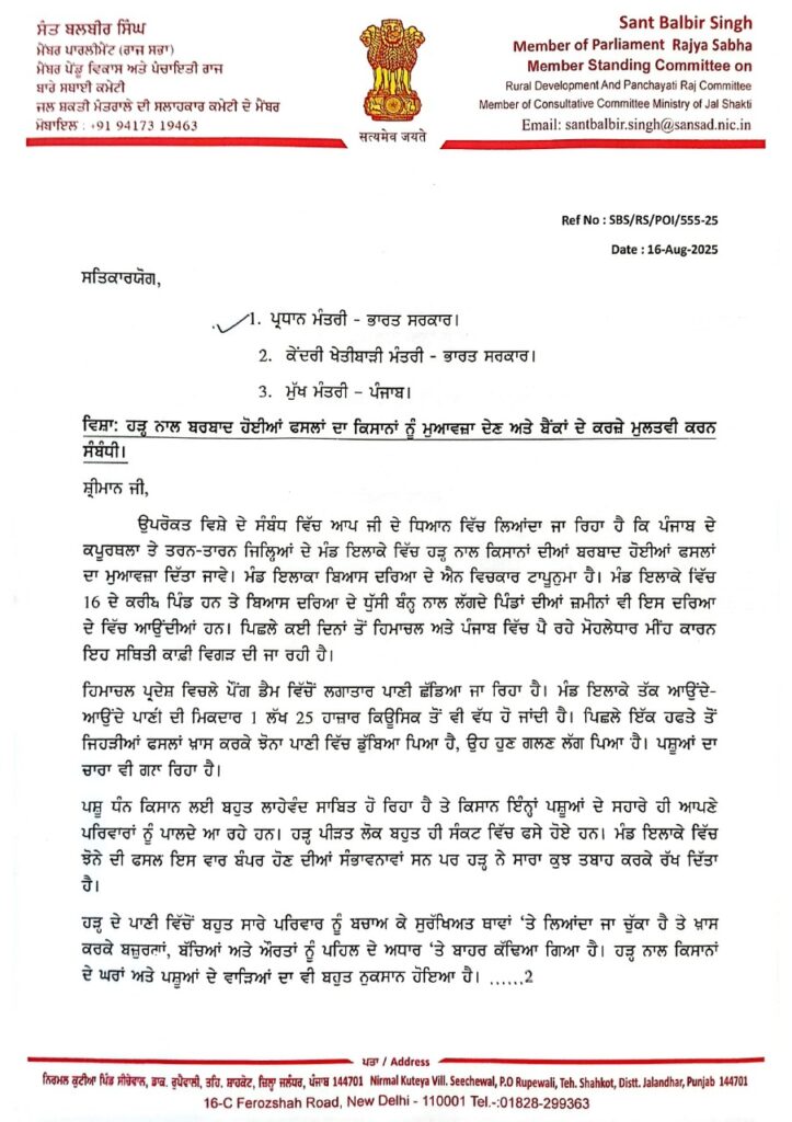 ਰਾਜ ਸਭਾ ਮੈਂਬਰ ਅਤੇ ਵਾਤਾਵਰਣ ਪ੍ਰੇਮੀ ਸੰਤ ਬਲਬੀਰ ਸਿੰਘ ਸੀਚੇਵਾਲ ਜੀ ਨੇ ਪ੍ਰਧਾਨ ਮੰਤਰੀ ਨਰਿੰਦਰ ਮੋਦੀ, ਕੇਂਦਰੀ ਖੇਤੀਬਾੜੀ ਮੰਤਰੀ ਸ਼ਿਵਰਾਜ ਚੌਹਾਨ ਅਤੇ ਪੰਜਾਬ ਦੇ ਮੁੱਖ ਮੰਤਰੀ ਭਗਵੰਤ ਸਿੰਘ ਮਾਨ ਨੂੰ ਪੱਤਰ ਲਿਖ ਕੇ ਹੜ੍ਹ ਪ੍ਰਭਾਵਿਤ ਲੋਕਾਂ ਲਈ ਮੁਆਵਜ਼ਾ ਦੇਣ ਦੀ ਜ਼ੋਰਦਾਰ ਮੰਗ ਕੀਤੀ ਹੈ। ਉਨ੍ਹਾਂ ਆਪਣੇ ਪੱਤਰ ਵਿੱਚ ਲਿਖਿਆ ਹੈ ਕਿ ਹੜ੍ਹ ਪੀੜਤ ਕਿਸਾਨਾਂ ਦੀ ਬਾਂਹ ਫੜ੍ਹਨ ਦੀ ਅਪੀਲ ਕਰਦਿਆ ਪੱਤਰ ਰਾਹੀ ਪੀੜਤ ਕਿਸਾਨਾਂ ਵੱਲੋਂ ਜਿਹੜਾ ਕਰਜ਼ਾ ਬੈਂਕਾਂ ਤੋਂ ਲਿਆ ਗਿਆ ਹੈ। ਉਨ੍ਹਾਂ ਦੀਆਂ ਕਿਸ਼ਤਾਂ ਮੁਲਤਵੀ ਕਰਨ ਤੇ ਕਿਸਾਨਾਂ ਦੀਆਂ ਤਬਾਹ ਹੋਈਆਂ ਫਸਲਾਂ ਦਾ ਉਚਿਤ ਦਾ ਮੁਆਵਜ਼ਾ ਦੇਣ ਦੀ ਮੰਗ ਕੀਤੀ। ਪੀੜਤ ਕਿਸਾਨਾਂ ਦੇ ਖੇਤਾਂ ਦੀ ਵਿਸ਼ੇਸ਼ ਗੋਦਵਾਰੀਆਂ ਕਰਵਾਈਆਂ ਜਾਣ ਤਾਂ ਜੋ ਨੁਕਸਾਨ ਦਾ ਅੰਦਾਜ਼ਾ ਲਗਾਇਆ ਜਾ ਸਕੇ।