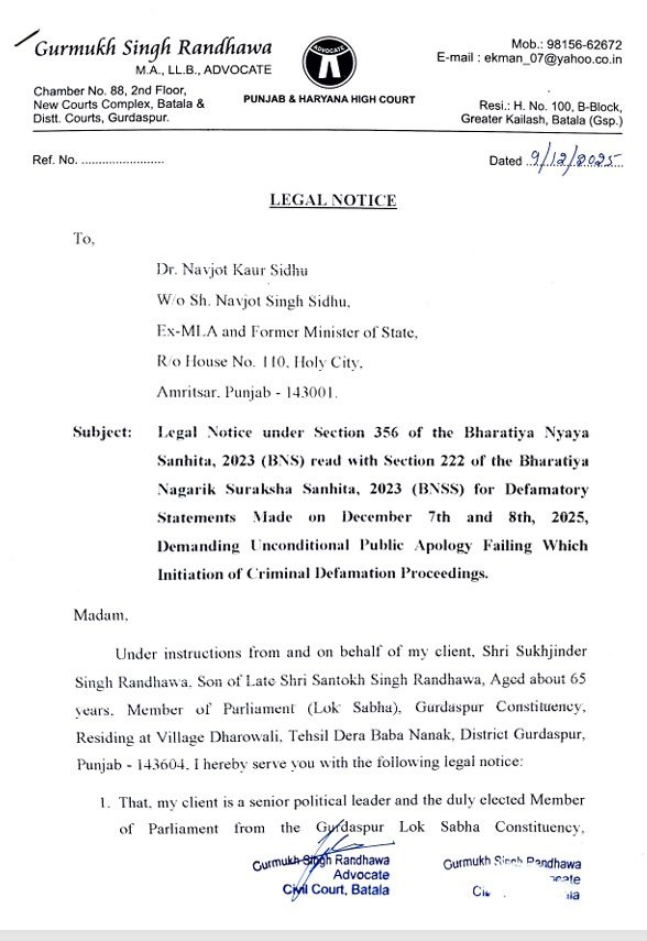ਪੰਜਾਬ ਕਾਂਗਰਸ ਦੇ ਸੰਸਦ ਮੈਂਬਰ ਸੁਖਜਿੰਦਰ ਰੰਧਾਵਾ ਨੇ ਡਾ. ਨਵਜੋਤ ਕੌਰ ਸਿੱਧੂ ਨੂੰ ਕਾਨੂੰਨੀ ਨੋਟਿਸ ਭੇਜਿਆ ਹੈ। ਬੀਤੇ ਕੱਲ੍ਹ ਸੋਮਵਾਰ ਨੂੰ ਨਵਜੋਤ ਕੌਰ ਸਿੱਧੂ ਨੇ ਸੁਖਜਿੰਦਰ ਸਿੰਘ ਰੰਧਾਵਾ ‘ਤੇ ਗੰਭੀਰ ਇਲਜ਼ਾਮ ਲਗਾਏ ਸੀ। ਜਵਾਬ ਵਿੱਚ, ਰੰਧਾਵਾ ਨੇ ਇੱਕ ਕਾਨੂੰਨੀ ਨੋਟਿਸ ਜਾਰੀ ਕਰਕੇ ਸੱਤ ਦਿਨਾਂ ਦੇ ਅੰਦਰ ਮੁਆਫ਼ੀ ਮੰਗਣ ਦੀ ਮੰਗ ਕੀਤੀ ਹੈ ਨਹੀਂ ਤਾਂ ਉਹ ਕਾਨੂੰਨੀ ਕਾਰਵਾਈ ਕਰਨਗੇ।