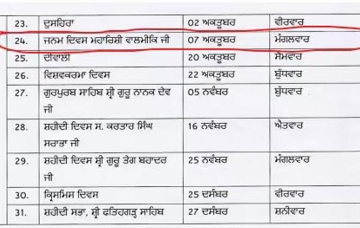 ਸੂਬਾ ਸਰਕਾਰ ਵੱਲੋਂ 7 ਅਕਤੂਬਰ ਨੂੰ ਸਰਕਾਰੀ ਛੁੱਟੀ ਦਾ ਐਲਾਨ ਕੀਤਾ ਗਿਆ ਹੈ। ਮਹਾਰਿਸ਼ੀ ਭਗਵਾਨ ਵਾਲਮੀਕਿ ਜਯੰਤੀ ਮੌਕੇ ਸੂਬੇ ਭਰ ਵਿਚ ਜਨਤਕ ਛੁੱਟੀ ਐਲਾਨੀ ਗਈ ਹੈ। ਇਸ ਦਿਨ ਸਾਰੇ ਸਕੂਲ, ਕਾਲਜ, ਬੈਂਕ ਤੇ ਸਰਕਾਰੀ ਦਫਤਰ ਬੰਦ ਰਹਿਣਗੇ।