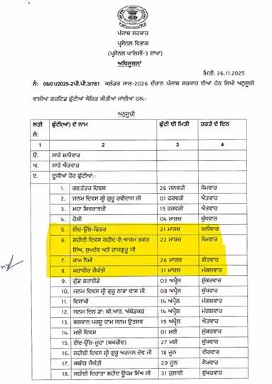 23 ਮਾਰਚ, ਸੋਮਵਾਰ ਨੂੰ, ਪੰਜਾਬ ਸਰਕਾਰ ਨੇ ਸ਼ਹੀਦ-ਏ-ਆਜ਼ਮ ਭਗਤ ਸਿੰਘ, ਸੁਖਦੇਵ ਅਤੇ ਰਾਜਗੁਰੂ ਦੇ ਸ਼ਹੀਦੀ ਦਿਵਸ ਦੇ ਮੌਕੇ ‘ਤੇ ਛੁੱਟੀ ਦਾ ਐਲਾਨ ਵੀ ਕੀਤਾ ਹੈ। ਇਸ ਦਿਨ ਕੋਈ ਵੀ ਕੰਮ ਨਹੀਂ ਹੋਵੇਗਾ, ਖਾਸ ਕਰਕੇ ਸਰਕਾਰੀ ਦਫ਼ਤਰਾਂ ਵਿੱਚ।