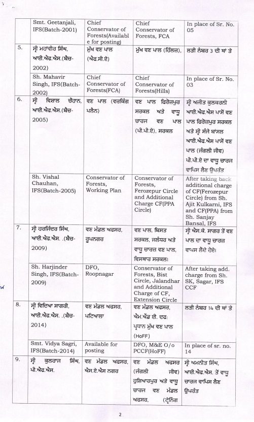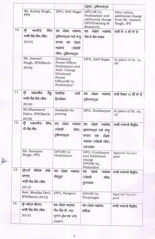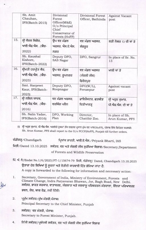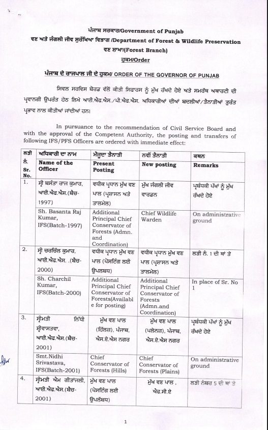 ਰਿਪੋਰਟਾਂ ਅਨੁਸਾਰ, ਪੰਜਾਬ ਸਰਕਾਰ ਨੇ ਭਾਰਤੀ ਜੰਗਲਾਤ ਸੇਵਾ (IFS) ਅਤੇ ਪੰਜਾਬ ਜੰਗਲਾਤ ਸੇਵਾ (PFS) ਦੇ 17 ਅਧਿਕਾਰੀਆਂ ਦੇ ਤਬਾਦਲੇ ਅਤੇ ਨਵੀਆਂ ਨਿਯੁਕਤੀਆਂ ਦੇ ਹੁਕਮ ਜਾਰੀ ਕੀਤੇ ਹਨ। ਇਹ ਹੁਕਮ ਤੁਰੰਤ ਲਾਗੂ ਹੋਣਗੇ।