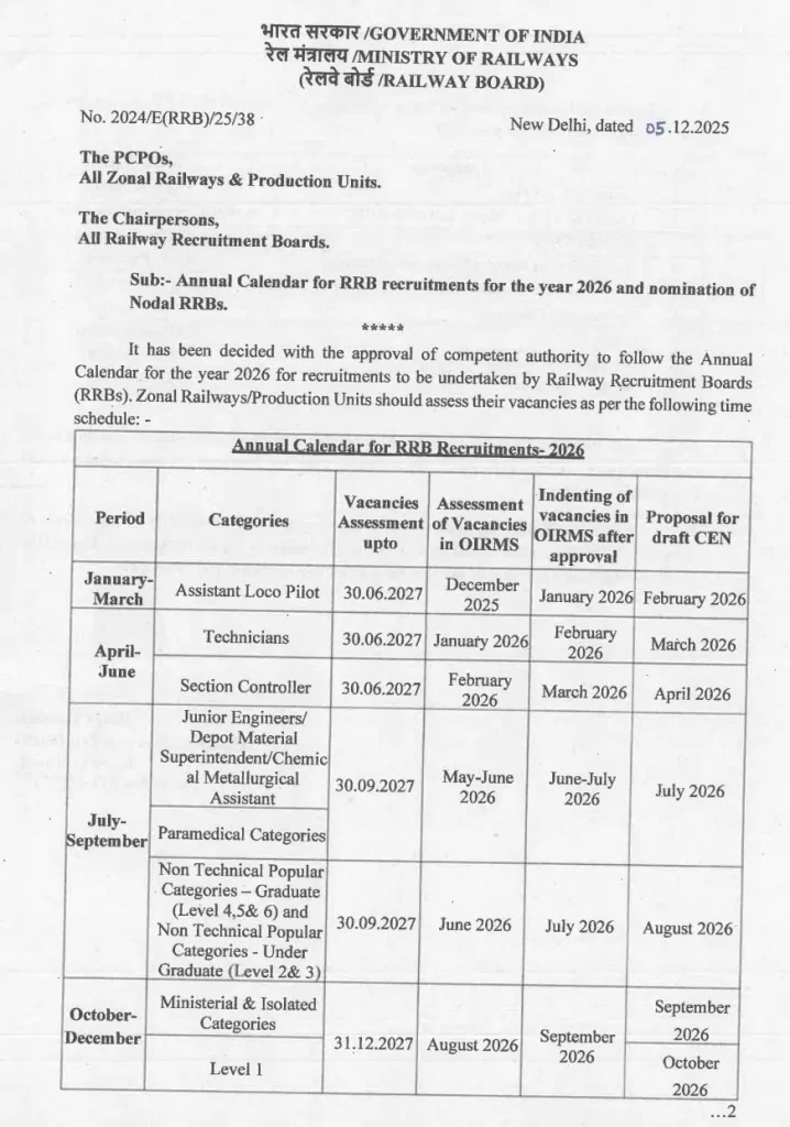 ਇਸ ਤੋਂ ਇਲਾਵਾ, 2026 ਭਰਤੀ ਸਾਲ ਲਈ ਸਾਰੇ ਭਰਤੀ ਯਤਨਾਂ ਦਾ ਤਾਲਮੇਲ ਕਰਨ ਲਈ ਇੱਕ ਨੋਡਲ RRB ਨਿਯੁਕਤ ਕੀਤਾ ਗਿਆ ਹੈ। RRB ਬੰਗਲੁਰੂ ਦੇ ਚੇਅਰਮੈਨ ਸਾਰੇ ਜ਼ੋਨਲ ਰੇਲਵੇ, ਉਤਪਾਦਨ ਇਕਾਈਆਂ ਅਤੇ ਹੋਰ RRB ਨੂੰ ਖਾਲੀ ਅਸਾਮੀਆਂ ਦੇ ਮੁਲਾਂਕਣ ਦਾ ਇੱਕ ਵਿਸਤ੍ਰਿਤ ਸਮਾਂ-ਸਾਰਣੀ ਭੇਜਣਗੇ। ਸਾਰੀਆਂ ਇਕਾਈਆਂ ਨੂੰ ਨਿਰਦੇਸ਼ ਦਿੱਤੇ ਗਏ ਹਨ ਕਿ ਉਹ ਨਿਰਦੇਸ਼ ਅਨੁਸਾਰ ਤੁਰੰਤ ਕਾਰਵਾਈ ਕਰਨ ਅਤੇ ਪ੍ਰਗਤੀ ਰਿਪੋਰਟਾਂ ਸਾਂਝੀਆਂ ਕਰਨ।