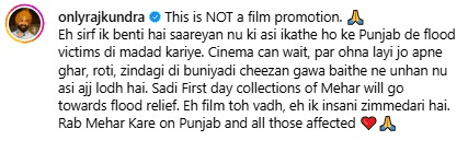 ਪੰਜਾਬ ਦੇ ਕਈ ਜ਼ਿਲ੍ਹੇ ਇਸ ਸਮੇਂ ਹੜ੍ਹਾਂ ਦੀ ਮਾਰ ਝੱਲ ਰਹੇ ਹਨ। ਪੰਜਾਬੀ ਗਾਇਕਾਂ ਦੇ ਨਾਲ ਨਾਲ ਬਾਲੀਵੁੱਡ ਦੇ ਕਈ ਫ਼ਿਲਮੀ ਸਿਤਾਰੇ ਹੜ੍ਹ ਪ੍ਰਭਾਵਿਤ ਇਲਾਕਿਆਂ ਤੇ ਲੋਕਾਂ ਦੀ ਮਦਦ ਲਈ ਅੱਗੇ ਆਏ ਹਨ। ਇਸ ਦੌਰਾਨ, ਬਾਲੀਵੁੱਡ ਅਦਾਕਾਰਾ ਸ਼ਿਲਪਾ ਸ਼ੈੱਟੀ ਦੇ ਪਤੀ ਅਤੇ ਅਦਾਕਾਰ ਰਾਜ ਕੁੰਦਰਾ ਵੀ ਮਦਦ ਲਈ ਅੱਗੇ ਆਏ ਹਨ। ਉਨ੍ਹਾਂ ਨੇ ਐਲਾਨ ਕੀਤਾ ਹੈ ਕਿ ਉਨ੍ਹਾਂ ਦੀ ਆਉਣ ਵਾਲੀ ਪੰਜਾਬੀ ਫ਼ਿਲਮ ‘ਮੇਹਰ’ ਦੀ ਪਹਿਲੇ ਦਿਨ ਦੀ ਬਾਕਸ ਆਫਿਸ ਕਮਾਈ ਹੜ੍ਹ ਪੀੜਤਾਂ ਨੂੰ ਦਿੱਤੀ ਜਾਵੇਗੀ।