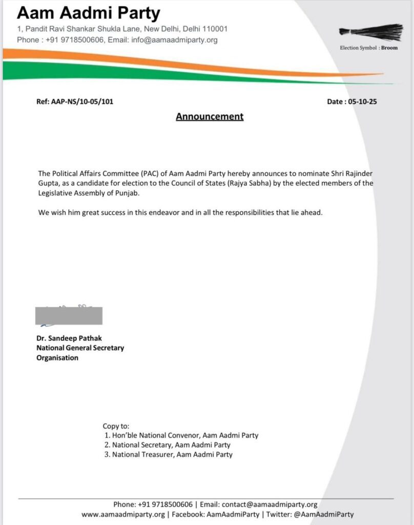 AAP ਨੇ ਟ੍ਰਾਈਡੈਂਟ ਗਰੁੱਪ ਦੇ ਚੇਅਰਮੈਨ ਰਾਜਿੰਦਰ ਗੁਪਤਾ ਨੂੰ ਰਾਜ ਸਭਾ ਲਈ ਉਮੀਦਵਾਰ ਵਜੋਂ ਨਾਮਜ਼ਦ ਕੀਤਾ ਹੈ।