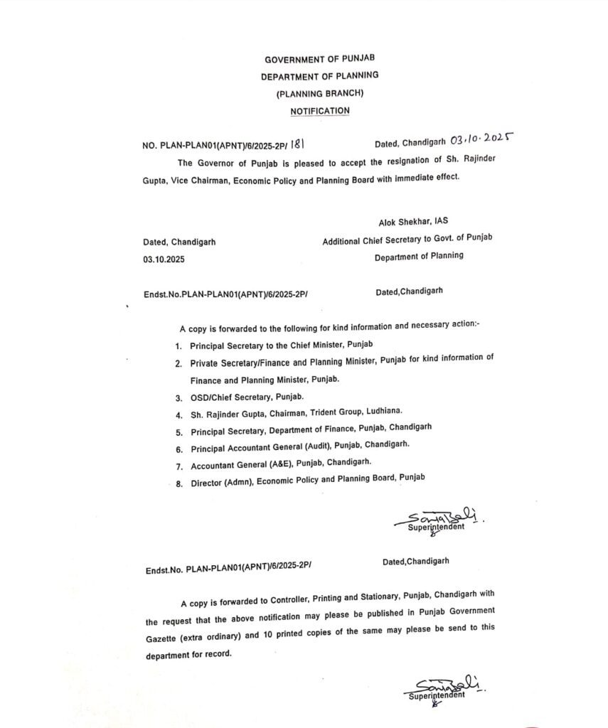 ਟਰਾਈਡੈਂਟ ਗਰੁੱਪ ਦੇ ਸੰਸਥਾਪਕ ਰਜਿੰਦਰ ਗੁਪਤਾ ਵੱਲੋਂ ਯੋਜਨਾ ਬੋਰਡ ਪੰਜਾਬ ਦੇ ਵਾਈਸ ਚੇਅਰਮੈਨੀ ਦੇ ਅਹੁਦੇ ਤੋਂ ਦਿੱਤਾ ਗਿਆ ਅਸਤੀਫਾ ਮਨਜ਼ੂਰ ਕਰ ਲਿਆ ਗਿਆ ਹੈ।