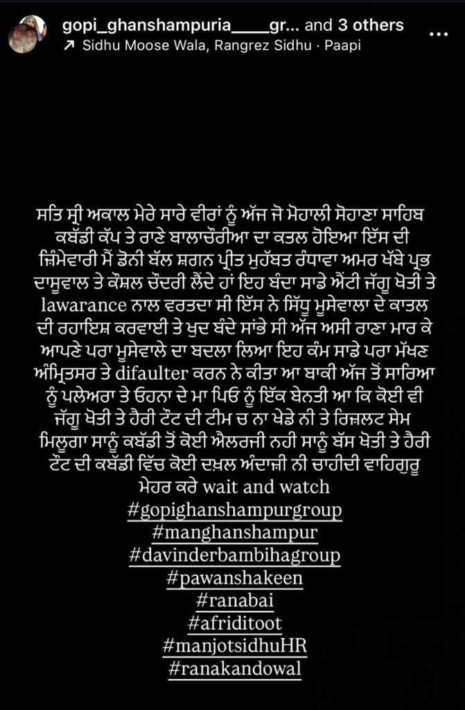 ਉਸ ਨੇ ਪੋਸਟ ਸਾਂਝੀ ਕਰਕੇ ਲਿਖਿਆ, “ਸਤਿ ਸ੍ਰੀ ਅਕਾਲ ਮੇਰੇ ਸਾਰੇ ਵੀਰਾਂ ਨੂੰ ਅੱਜ ਜੋ ਮੋਹਾਲੀ ਸੋਹਾਣਾ ਸਾਹਿਬ ਕਬੱਡੀ ਕੱਪ ਤੇ ਰਾਣੇ ਬਾਲਾਚੌਰੀਆ ਦਾ ਕਤਲ ਹੋਇਆ ਇੱਸ ਦੀ ਜ਼ਿੰਮੇਵਾਰੀ ਮੈਂ ਡੋਨੀ ਬੱਲ ਸ਼ਗਨ ਪ੍ਰੀਤ ਮੁਹੱਬਤ ਰੰਧਾਵਾ ਅਮਰ ਖੱਬੇ ਪ੍ਰਭ ਦਾਸੂਵਾਲ ਤੇ ਕੌਸ਼ਲ ਚੌਦਰੀ ਲੈਂਦੇ ਹਾਂ ਇਹ ਬੰਦਾ ਸਾਡੇ ਐਂਟੀ ਜੱਗੂ ਖੋਤੀ ਤੇ lawarance ਨਾਲ ਵਰਤਦਾ ਸੀ ਇੱਸ ਨੇ ਸਿੱਧੂ ਮੂਸੇਵਾਲਾ ਦੇ ਕਾਤਲ ਦੀ ਰਹਾਇਸ਼ ਕਰਵਾਈ ਤੇ ਖੁਦ ਬੰਦੇ ਸਾਂਭੇ ਸੀ ਅੱਜ ਅਸੀ ਰਾਣਾ ਮਾਰ ਕੇ ਆਪਣੇ ਪਰਾ ਮੂਸੇਵਾਲੇ ਦਾ ਬਦਲਾ ਲਿਆ ਇਹ ਕੰਮ ਸਾਡੇ ਪਰਾ ਮੱਖਣ ਅੰਮ੍ਰਿਤਸਰ ਤੇ difaulter ਕਰਨ ਨੇ ਕੀਤਾ ਆ ਬਾਕੀ ਅੱਜ ਤੋਂ ਸਾਰਿਆ ਨੂੰ ਪਲੇਅਰਾ ਤੇ ਓਹਨਾ ਦੇ ਮਾ ਪਿਓ ਨੂੰ ਇੱਕ ਬੇਨਤੀ ਆ ਕਿ ਕੋਈ ਵੀ ਜੱਗੂ ਖੋਤੀ ਤੇ ਹੈਰੀ ਟੌਟ ਦੀ ਟੀਮ ਚ ਨਾ ਖੇਡੇ ਨੀ ਤੇ ਰਿਜ਼ਲਟ ਸੇਮ ਮਿਲੂਗਾ ਸਾਨੂੰ ਕਬੱਡੀ ਤੋਂ ਕੋਈ ਐਲਰਜੀ ਨਹੀ ਸਾਨੂੰ ਬੱਸ ਖੋਤੀ ਤੇ ਹੈਰੀ ਟੌਟ ਦੀ ਕਬੱਡੀ ਵਿੱਚ ਕੋਈ ਦਖ਼ਲ ਅੰਦਾਜ਼ੀ ਨੀ ਚਾਹੀਦੀ ਵਾਹਿਗੁਰੂ ਮੇਹਰ ਕਰੇ wait and watch”