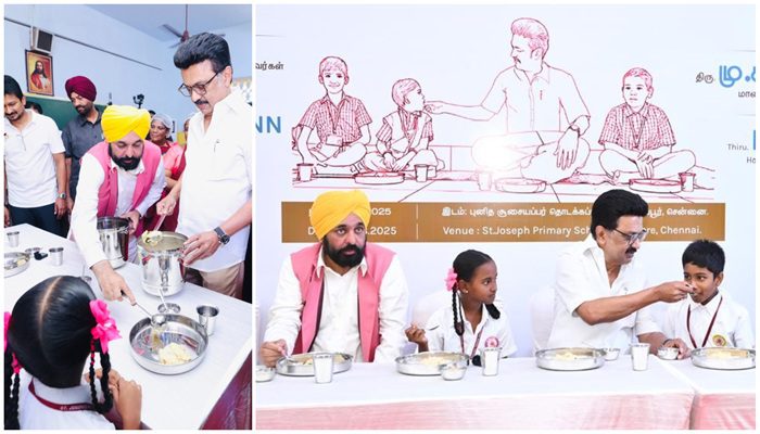 ਪੰਜਾਬ ਦੇ ਮੁੱਖ ਮੰਤਰੀ ਭਗਵੰਤ ਮਾਨ ਤਾਮਿਲਨਾਡੂ ਦੇ ਦੌਰੇ ‘ਤੇ ਹਨ। ਮੰਗਲਵਾਰ ਨੂੰ, ਉਨ੍ਹਾਂ ਨੇ ਉੱਥੋਂ ਦੀ ਸਰਕਾਰ ਵੱਲੋਂ ਸ਼ਹਿਰੀ ਪ੍ਰਾਇਮਰੀ ਸਕੂਲਾਂ ਲਈ ਸ਼ੁਰੂ ਕੀਤੀ ਗਈ ਮੁੱਖ ਮੰਤਰੀ ਨਾਸ਼ਤਾ ਯੋਜਨਾ ਵਿੱਚ ਮੁੱਖ ਮਹਿਮਾਨ ਵਜੋਂ ਸ਼ਿਰਕਤ ਕੀਤੀ। ਮੁੱਖ ਮੰਤਰੀ ਐਮ.ਕੇ. ਸਟਾਲਿਨ ਦੇ ਨਾਲ, ਉਨ੍ਹਾਂ ਨੇ ਪਹਿਲਾਂ ਬੱਚਿਆਂ ਨੂੰ ਖਾਣਾ ਪਰੋਸਿਆ ਅਤੇ ਫਿਰ ਉਨ੍ਹਾਂ ਨਾਲ ਬੈਠ ਕੇ ਖਾਣਾ ਖਾਧਾ। ਇਸ ਮੌਕੇ ਉਨ੍ਹਾਂ ਕਿਹਾ ਕਿ ਪੰਜਾਬ ਆਪਣੇ ਸਕੂਲਾਂ ਵਿੱਚ ਵੀ ਇਸ ਯੋਜਨਾ ਨੂੰ ਲਾਗੂ ਕਰੇਗਾ। ਇਸ ਵਿਸ਼ੇ ‘ਤੇ ਕੈਬਨਿਟ ਵਿੱਚ ਚਰਚਾ ਕੀਤੀ ਜਾਵੇਗੀ।