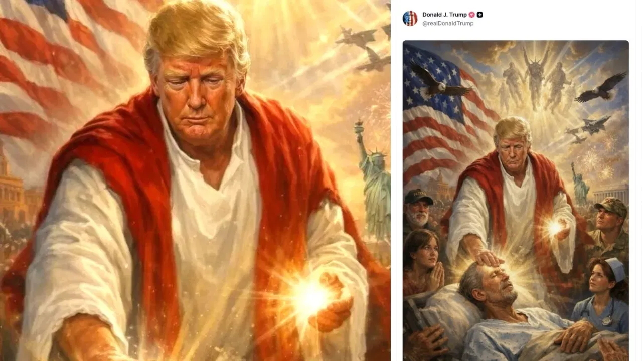 ਸੋਸ਼ਲ ਮੀਡੀਆ ਪਲੇਟਫਾਰਮ, ਟਰੂਥ ਸੋਸ਼ਲ ‘ਤੇ ਪੋਸਟ ਕੀਤੀ ਗਈ ਫੋਟੋ ਵਿੱਚ ਰਾਸ਼ਟਰਪਤੀ ਟਰੰਪ ਨੂੰ ਲਾਲ ਅਤੇ ਚਿੱਟੇ ਕੱਪੜੇ ਪਹਿਨੇ, ਇੱਕ ਬਿਮਾਰ ਆਦਮੀ ਦੇ ਮੱਥੇ ਨੂੰ ਛੂਹਦੇ ਹੋਏ, ਉਸਦੇ ਹੱਥਾਂ ਅਤੇ ਸਿਰ ਤੋਂ ਇੱਕ ਚਮਕਦਾਰ ਰੌਸ਼ਨੀ ਨਿਕਲਦੀ ਦਿਖਾਈ ਦਿੰਦੀ ਹੈ। ਪਿਛੋਕੜ ਵਿੱਚ ਇੱਕ ਅਮਰੀਕੀ ਝੰਡਾ ਲਹਿਰਾਉਂਦਾ ਹੈ, ਜਦੋਂ ਕਿ ਕਈ ਲੋਕ ਰਾਸ਼ਟਰਪਤੀ ਨੂੰ ਸ਼ਰਧਾ ਨਾਲ ਵੇਖਦੇ ਹਨ।
