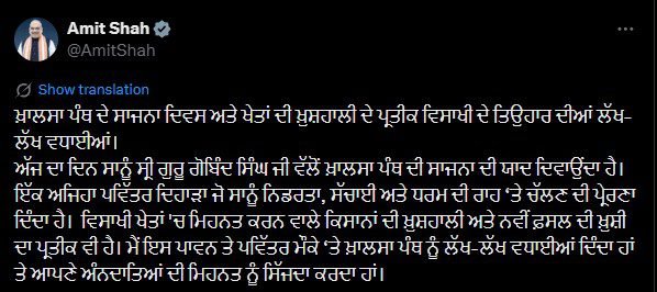 ਕੇਂਦਰੀ ਗ੍ਰਹਿ ਮੰਤਰੀ ਅਮਿਤ ਸ਼ਾਹ ਨੇ ਖਾਲਸਾ ਪੰਥ ਦੇ ਸਥਾਪਨਾ ਦਿਵਸ ਅਤੇ ਵਿਸਾਖੀ ਦੇ ਮੌਕੇ ‘ਤੇ ਦਿੱਤੀਆਂ ਵਧਾਈਆਂ